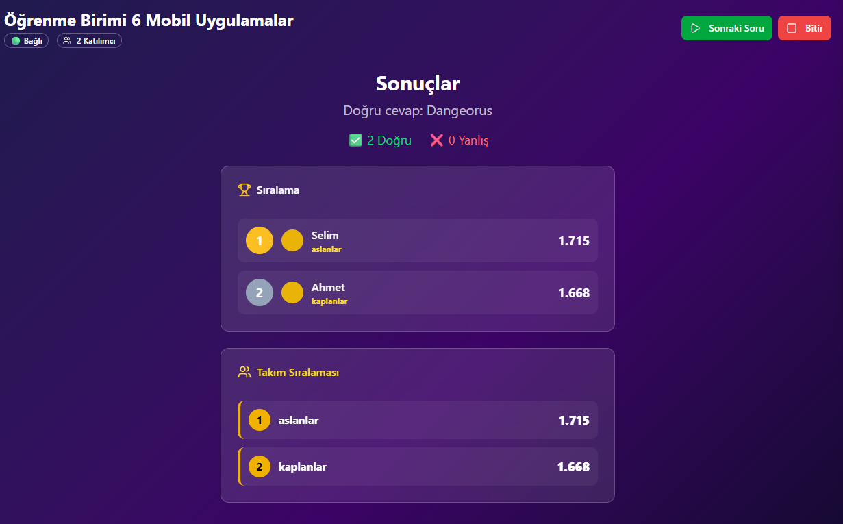 Kahoot tarzı sınavlar oluşturun takımlı veya bireysel olarak öğrencilerinizi hem yarıştırın hemde öğretin! Dilerseniz yarışmalarınızı yapay zeka asistanı yardımıylada oluşturabilirsiniz. Şimdiden iyi eğlenceler
