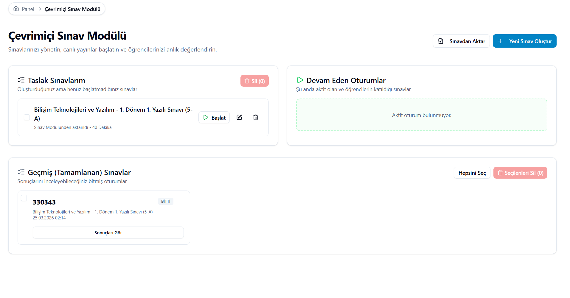 İster kendi sorularınızı sıfırdan hazırlayın isterseniz Sınav modülün'de hazırlamış olduğunuz sınavlarınızı hızlaca Çevrimiçi Modülündeki taslak sınavlarınıza aktarın. "Sınavdan Aktar" butonuna tıklayarak daha önce oluşturmuş olduğunuz sınavları seçerek anında çevrimiçi sınavlar gerçekleştirin. Öğrencilerinizin sınava katılabilmesi için sistem tarafından oluşturulan kaıtlım adresini öğrencilerinize gönderin ve tek tıklamayla sınav giriş sayfasına ulaşabilirler.